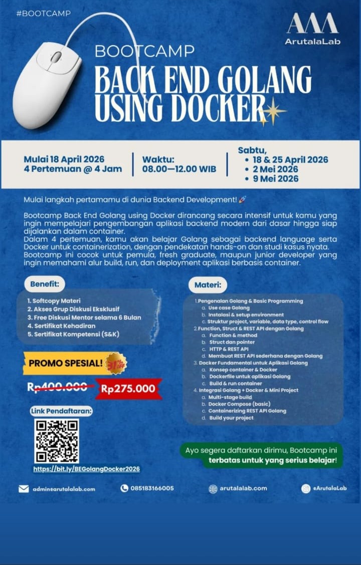 Dalam 4 pertemuan, kamu akan belajar Golang sebagai backend language serta Docker untuk containerization, dengan pendekatan hands-on dan studi kasus nyata. Bootcamp ini cocok untuk pemula, fresh graduate, maupun junior developer yang ingin memahami alur build, run, dan deployment aplikasi berbasis container.